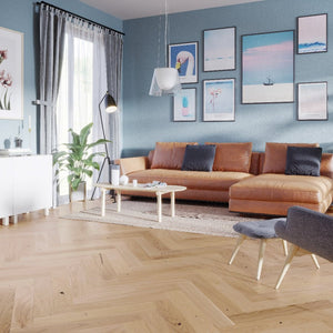 Ashton & Rose Midland Floating Herringbone Flooring. A stunning blend of craftsmanship and timeless design. Featuring premium oak veneers, this flooring highlights the natural beauty of wood grain, knots, and subtle textures. The elegant herringbone pattern elevates any room, offering a classic yet contemporary aesthetic.